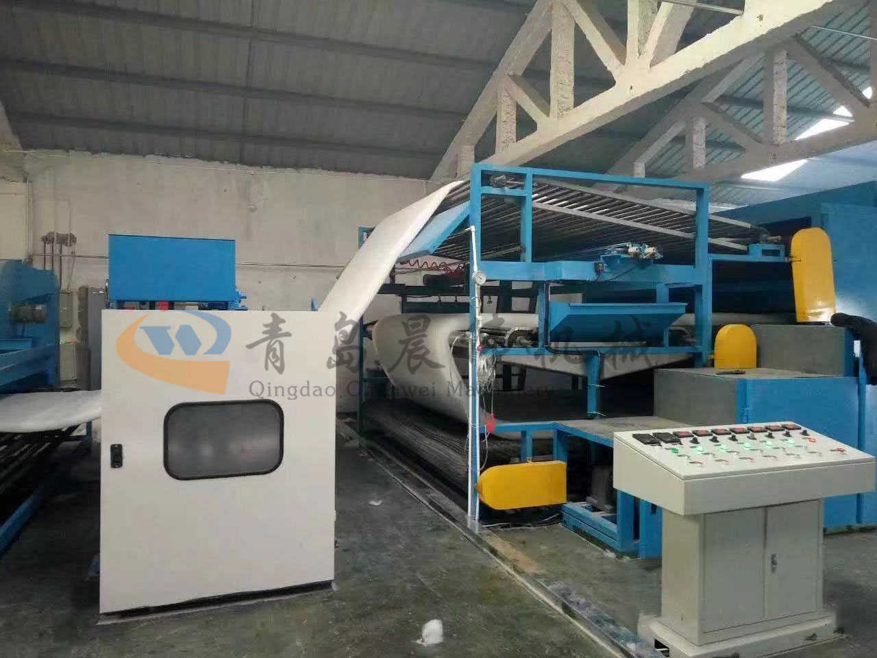 5. CWPW-鋪網機:用于將梳理纖網通過移動小車交叉折疊為所需幅寬和定量的多層纖網,以供后道工序使用。鋪網輥采用特殊結構,加裝壓網輥和導流板,不飄網不起皺,五只大功率電機精確控制各部件的運動,電動輸出簾高度調節裝置
